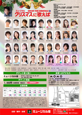 守屋由貴さんと2016年に創作したミュージカル「月に歌えば」。古今東西の「月」にまつわるエピソードを集めたコンセプト・ミュージカル。創る側もとても楽しく、舞台中央に作曲家が座ってピアノ演奏をしながらMCをして歌も歌うという独自のスタイルも気に入って、続編を考えていました。何にしようかな?「星に歌えば」もいいな。「海に歌えば」も創れるな。2018年のクリスマス時期に駅ビルの中を歩いていたところ、クリスマス・ソングが永遠と流れてきて、頭の中は自然とクリスマス・モードに。いくつかの場面が浮かび、家に帰って、さっそく守屋さんにメールを打ちました。「クリスマスに歌えば」なら、脚本が書きやすいと思います。」すぐに返信が「来年やりましょう!」ということで、ミュージカル「クリスマスに歌えば」を初演したのが2019年12月。劇場は、池袋シアターグリーンBOX in BOX THEATER。舞台セットも「月歌」と同じ、中央にバンドエリアがあって周囲を演技エリアで囲むセットでした。毎年クリスマス時期に何を上演するのか。私たちミュージカル関係者なら、誰もが妄想することでしょう。この作品は、その妄想を形にしたものです。クリスマス時期、クリスマスをいっぱいに感じながら、楽しくて心温まる舞台を製作したいと思っています。