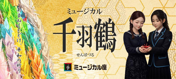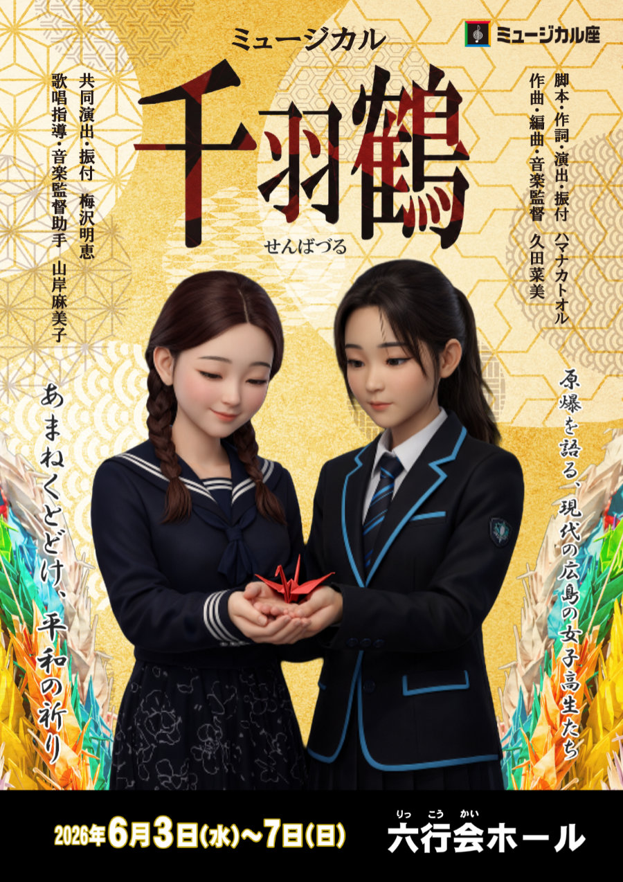 私はこれまで、ライフワークとして、戦争と平和に関する作品の発表を続けてきました。「ひめゆり(沖縄戦)」「わだつみのこえ(学徒出陣)」「アインシュタイン・フォーリーズ(アメリカ側から見た原爆投下)」「野の花(ドイツのユダヤ人迫害)」「スウィング・ボーイズ(戦時下でジャズを愛した男たち)」「東京ミュージカル(東京大空襲)」「パラレル(もし日本が戦争になったら)」「平和な星(強い国に攻められた時にどうするか)」と8作品になります。同じエピソードを書いたことは一度もありません。それだけ戦争については考えることが多いのです。現在の世界情勢を考え、これからも戦争と平和について考え、舞台にして行きたいと思っています。 広島出身の劇団員、藤澤知佳たちと、広島の原爆について描いたミュージカルを製作すべきか、ここ10年、話し合ってきました。あまりに辛すぎて、苦しすぎて、舞台化することをためらう気持ちが強かったことが本音です。しかし、戦後81年。原爆の悲劇を語り継ぐ活動が転換期を迎えていることを痛感し、これはなんとか、今、未来に向けて語り継ぐ作品を作らねばならないと思う気持ちが強くなりました。 私の視点は現代です。現代の広島の女子高生たちが、広島の悲劇を後世に語り継ぐために何が出来るかを考え、クラス全体で太平洋戦争のことを調べて、ひとつのミュージカルを作って上演しようと行動を起こします。現代劇にすることで、今生きている私たちと同じ視点で、原爆と太平洋戦争をとらえることが出来ると思ったのです。なぜ、戦争が起こったのか? 私自身がまずはそこから探求したい気持ちが強いです。原爆の話となると、「ひめゆり」などと同じ、被害者の視点がどうしても強くなります。多くの一般市民が犠牲になったのだから当たり前です。ですが私はこの作品で、戦争をもっと全体からとらえたい。日本人がしたこと。海外で行ったこと。なぜ外国と戦争をしなければならなかったのか。原爆を落としたアメリカ人はどのように思っていたのか。戦争を起こさない方法はあるのか。非核三原則は堅持すべきか。この作品に登場する女子高生たちも戦争を経験していない立場から、こうした疑問に答えて作品を作るために勉強をします。彼女たちが行き着いた結論とは、いったいどのようなものだったのでしょうか。未来へ向けて重要な提言が出来れば、意義のある試みとなると思い、創作を開始します。 作曲は、「スター誕生」「スター誕生2」「チェアーズ」「ハートスートラ」「アワード」「劇場の神様」を私と一緒に作った久田菜美さんに頼みました。彼女が書くと名曲ぞろいの作品になるので、私もそのつもりで作詞したいと思っています。共同演出と振付の梅沢明恵さん、歌唱指導と音楽監督助手の山岸麻美子さんも、今もご一緒していますが、作品をよく理解して的確な助言をくれる心強いスタッフです。最強のスタッフが揃いましたので、長く上演を繰り返せるいい作品にするため、全力を尽くしたいと思います。 タイトルは、「千羽鶴」としました。「原爆少女の像」で有名な佐々木禎子さんが生前千羽鶴を折っていたことが有名で、広島には今も毎年多くの千羽鶴が送られています。去年の10月、私と一緒に広島に取材旅行に行った妻が、広島に千羽鶴を送ろうとしている姿を見て決めました。人は祈る時、なぜ千羽鶴を折るようになったのでしょうか。この作品の中で語りたいと思っています。また、チラシに書いた「あまねく届け、平和の祈り」という言葉は、爆心地の最も近くにあり、全校生徒がたった一人を除いて全員亡くなった本川小学校(劇団員藤澤知佳の母校)で、原爆資料館の横にある石碑に書かれている言葉です。今年は、6月「千羽鶴(広島)」、7月「ひめゆり(沖縄)」と、戦争を考える期間と致しました。どうぞご観劇くだされば幸いです。
