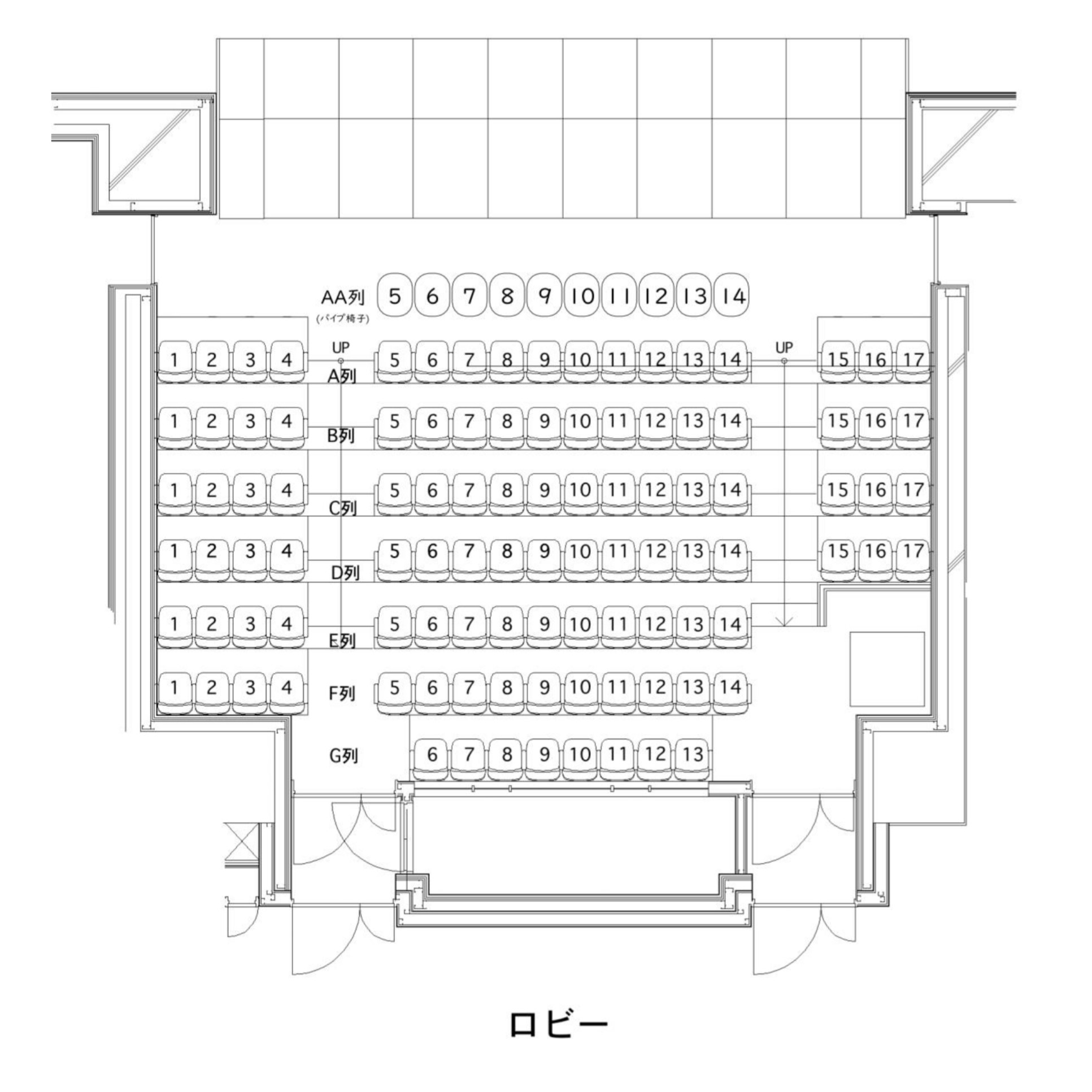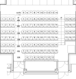 最前列は、センターブロックのみAA列となります。(AA列は劇場備え付けの小さいパイプ椅子を使用いたします。)