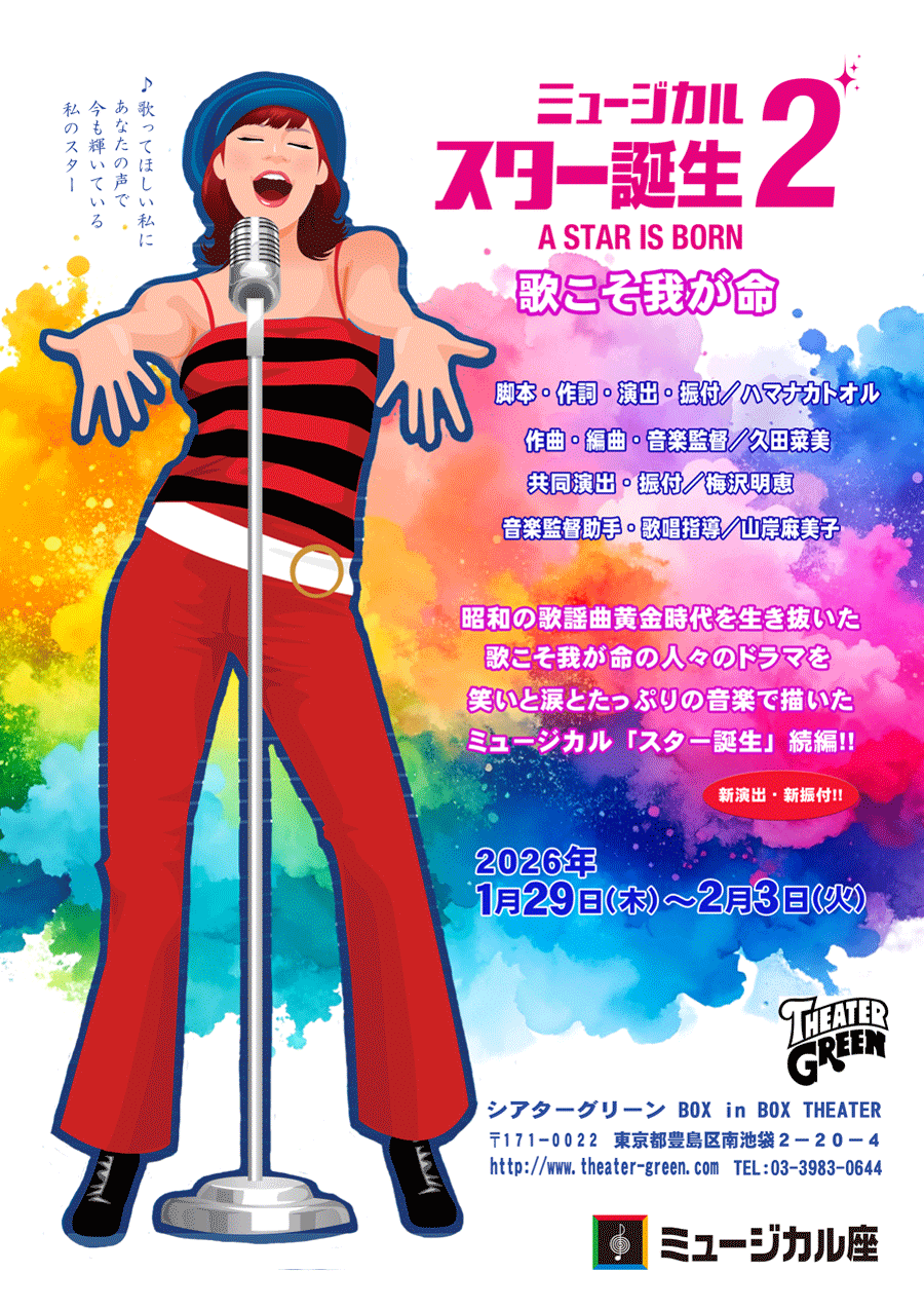 ミュージカル「スター誕生2」について 脚本・作詞・演出・振付/ハマナカトオル ミュージカル「スター誕生」の続編を作ろうという話は、初演の頃からありました。キャストやスタッフたちと、たびたびそんな話をしていましたし、歌や歌手たちをテーマにした題材は大好きなので、事あるごとにエピソードを収集していました。2021年夏、昭和史をじっくりと勉強して、執筆開始。同年11月に初演しました。初演が2015年9月ですから、続編発表まで6年かかったことになります。ちょっと遅い気もしますが、その分、自分のなかで熟成出来たようにも思います。第一作と第二作合わせて4時間の昭和歌謡史を描いた台本は、私の作品の中で一番の長編です。私もちょっとした研究家のようになってきました(笑)。第一話は、その年の賞レースを描いた一年間の物語でしたが、第二話は、アイドルがデビューしてヒット曲を出し、やがて売れなくなって行くまでの長い年月を描くドラマになりました。「スター誕生2」は、初演(2021年)・再演(2023年)と演出を中本吉成さんにおまかせしましたが、今回の公演は私が演出をすることになりました。いい舞台になるよう、スタッフ・キャストと力を合わせて頑張ります。 「スター誕生」について考えるたび、初演から出演してくださったキャストの方々の思い出がよみがえります。舞台は一期一会。その時しか見られない命のともしびです。こうしたスタイルの作品では、とくにそう思います。今回も素敵なキャストの方々と一緒に物語をつむいで行くことが出来れば、こんなに嬉しいことはありません。 ミュージカル「スター誕生」は、第一作目も魅力的な歌曲に溢れていました。初演後、多くのミュージカル俳優の方々がいろいろな場所で歌ってくれています。それもこの作品の特徴です。続編でも多くの方に歌い継いでほしい久田菜美さん作曲の名曲が誕生しています。第一話になかったジャンルの曲を入れることも、この作品を書くひとつの理由でした。極めつけのアイドル曲はもちろん、是非とも入れたかったロカビリー(ツイスト)や、ヌーヴェルヴァーグを象徴する反戦歌も出来上がりました。私自身、人生で一番好きなものは?と問われたら「歌」と答えるでしょう。歌は人生に不可欠のものです。心を慰め、元気を与えてくれます。一番好きな大切なものの価値をしっかりと伝えられる舞台にしたいと思っています。 昭和歌謡史と歌手たち、作詞家や作曲家、プロデューサーやマネージャーなどヒットメイカーたちの歌に命をかけた人生を描くミュージカル「スター誕生2」、どうぞご期待ください。